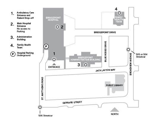 The conference is taking place in Bridgepoint’s main hospital building (marked Bridgepoint Hospital in the diagram below). The closest TTC stop is where the 505 & 504 stop is noted below. Underground parking is denoted by the ‘P’ in the main building.